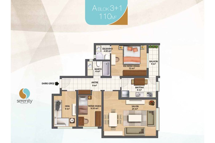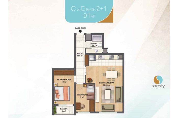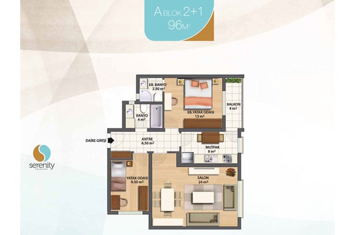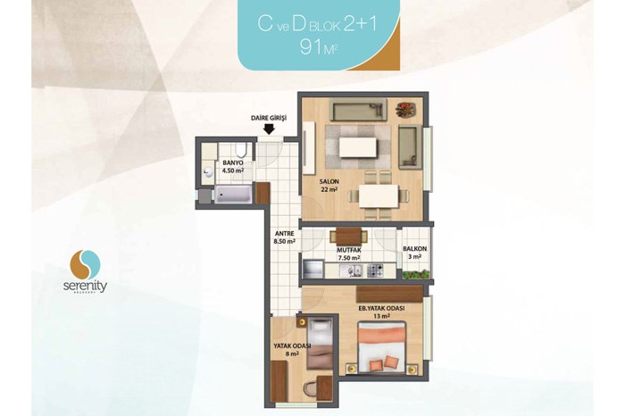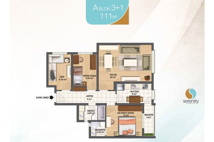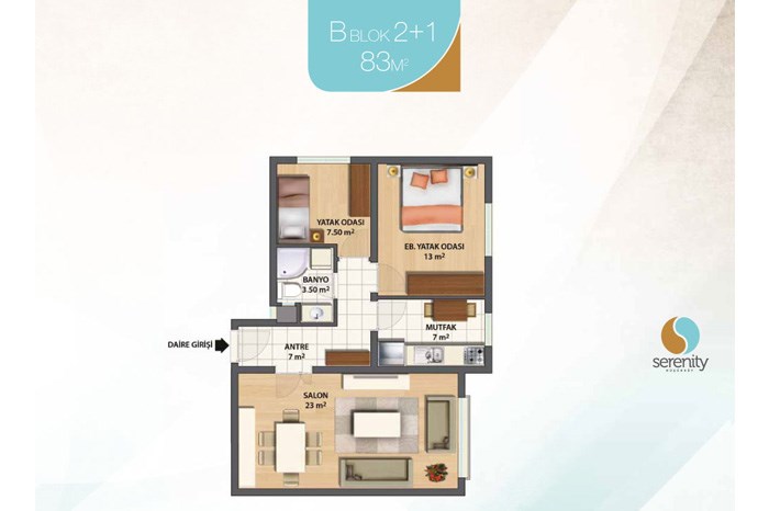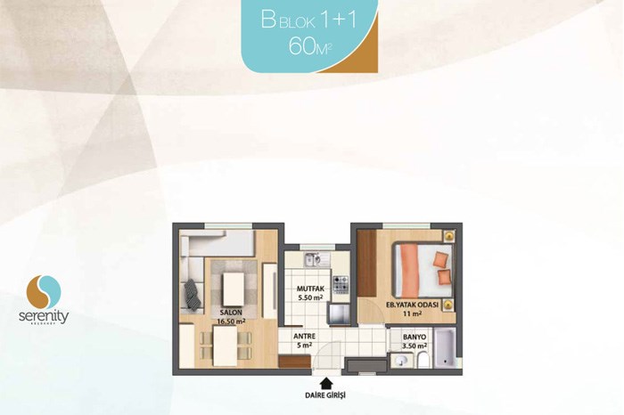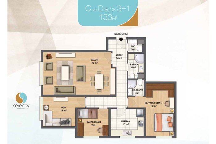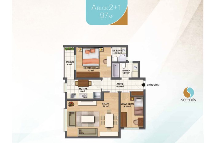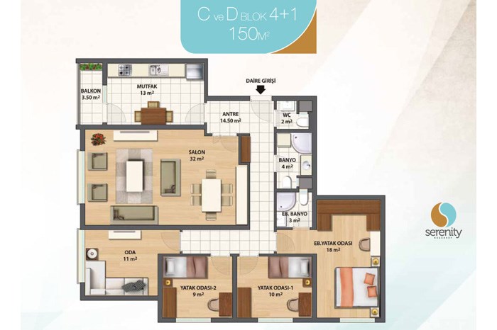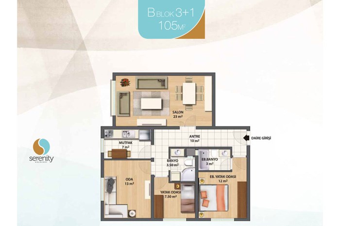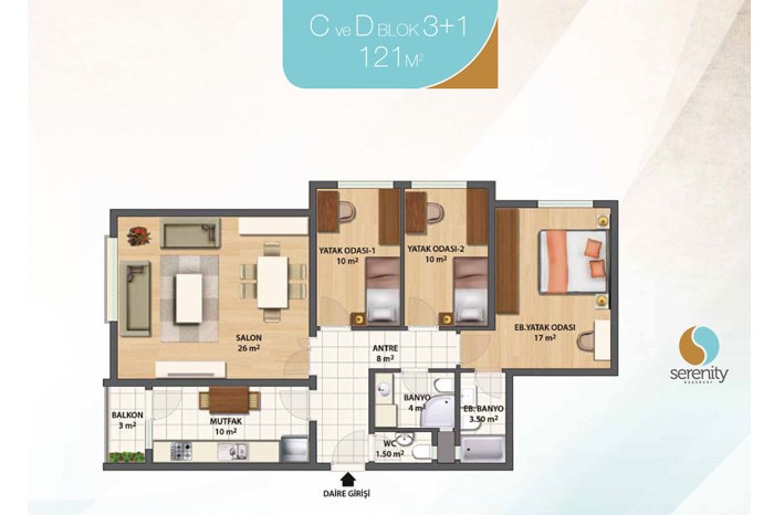 Serenity Küçükköy projesinde yer alan 1+1 daireler 60 metrekare, 2+1 daireler 83 ila 97 metrekare, 3+1 daireler 105 ila 133 metrekare, 4+1 daireler 150 metrekare alanlarla dizayn edildi.