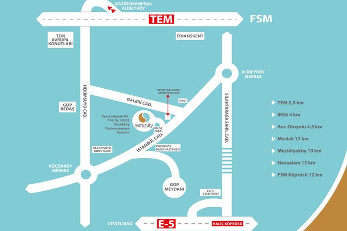 Satışları tamamlanan Serenity Küçükköy projesi Vialand AVM ve Vialand Tema Park'ın hemen karşısında yükseliyor. TEM ve E-5'in ortasında yer alan Serenity Küçükköy projesi ulaşım açısından avatajlı bir noktada konumlanıyor.