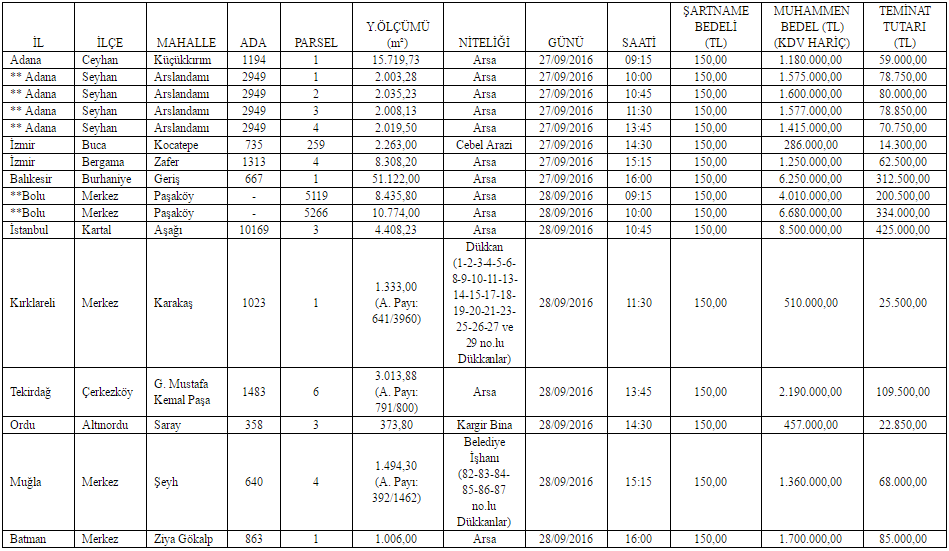 Satışa söz konusu gayrimenkullerin arasında arsa, cebel arazi, dükkan, kargir bina ve işhanı bulunuyor. Gayrimenkullerin yarısı 27 Eylül 2016 tarihinde diğer yarısı ise 28 Eylül 2016 tarihinde ihaleye çıkacak.
