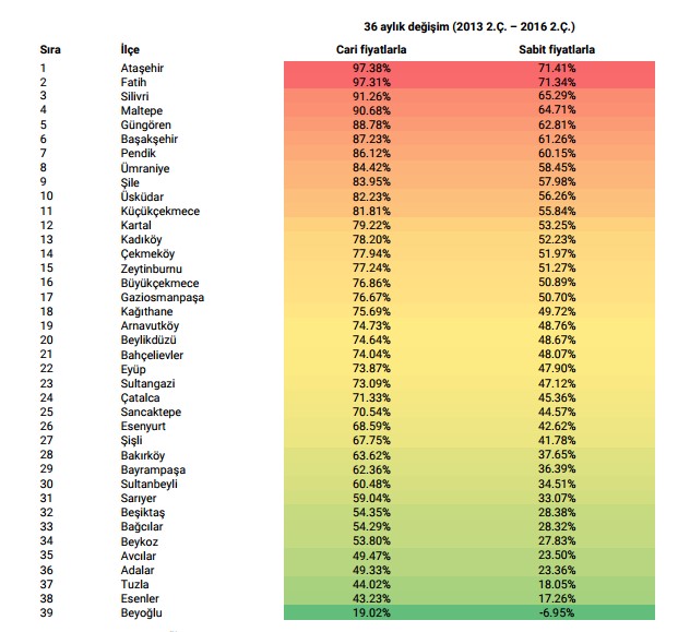 Buna göre 2013 yılının ikinci çeyreği ve 2016 yılının ikinci çeyreğini kapsayan son 3 yıllık dönemde İstanbul genelinde en yüksek artışların yaşandığı ilçeler Maltepe, Ataşehir, Pendik, Fatih, Silivri ile Şile oldu.