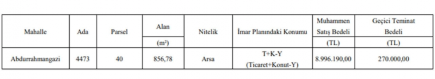 Ticaret ve konut alanı imarlı arsanın satış bedeli 8 milyon 996 bin 190 TL olarak belirlenirken, geçici teminat bedeli de 270 bin TL olarak belirlendi.