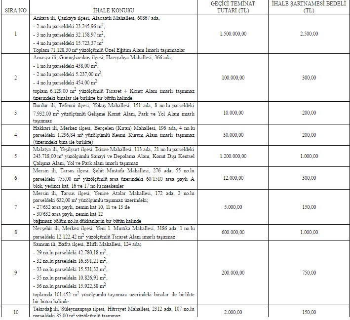 İhalelere katılmak için “İhale Şartnamesi”nin satın alınması zorunlu olup ihale şartnamesi holdingin T.C. Vakıflar Bankası Ankara Şubesi nezdinde ki TR 6300 0150 0158 0072 9272 1775 no.lu hesabına tabloda belirtilen tutar yatırılarak ve “İhalesine girilecek taşınmazın İhale Şartnamesi Bedeli” ifadesini içerir şekilde ve üstünde ihaleye katılacak olan gerçek kişi, tüzel kişi veya ortak girişim grubunun ve/veya ortak girişim gurubu üyelerinden birinin adının belirtildiği dekont karşılığında, Kuruluşun adresinden temin edilebilir.