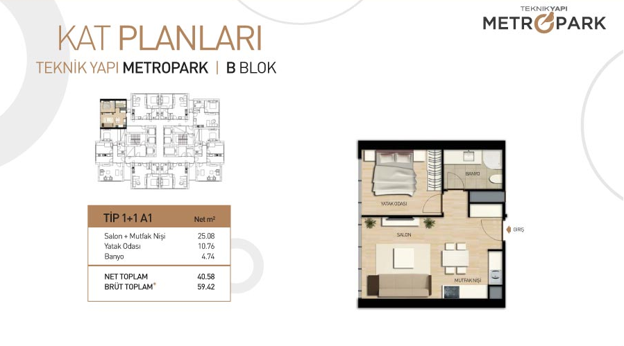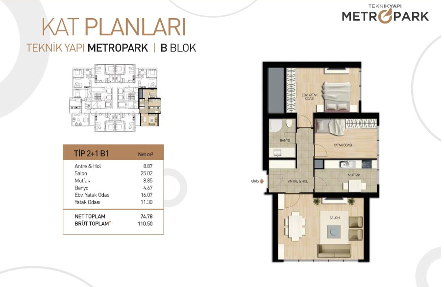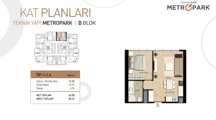 Metropark Towers projesinde 1 oda 1 salon daireler 58,68 ve 59,23 metrekare, 2 oda 1 salon daireler 110,52 metrekare alanlarla dizayn edildi.