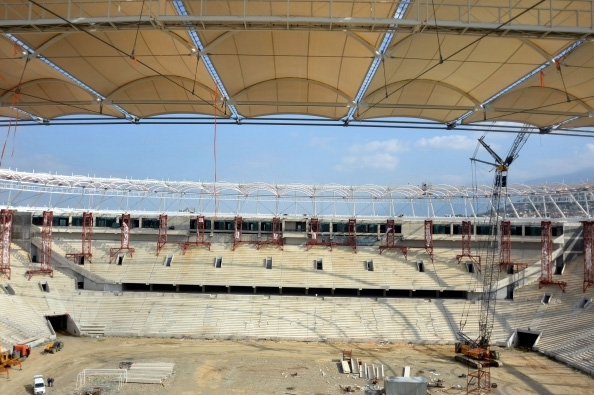 “İnce işler; enerji, aydınlatma, ses düzenleri, fayans, seramik ve tüm kaplamalarının yapımı tamamlandı. Çim sahamızın imalatı da hızla sürüyor. Şu anda sahada son 20 cm’lik toprak malzemenin kaplaması yapılıyor ve bu kaplamanın ardından da bu hafta sonu da çimler yayılmaya başlanacak. Daha önce Özlüce’de hazırlanan çimler artık buraya taşınacak ve önümüzdeki hafta stadımız yeşillenecek” diye konuştu.