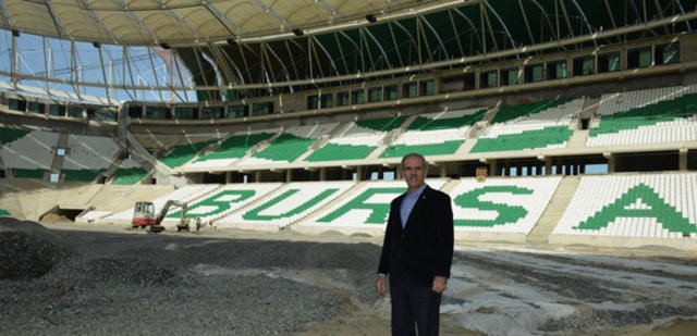 Büyükşehir Belediye Başkanı Recep Altepe, Büyükşehir Belediyesi tarafından Bursa’ya kazandırılan ve dünyanın en heyecan veren 10 stadyumu arasında gösterilen yeni stadyumda saha içi zeminin tamamlanmak üzere olduğunu, çimlerin de kısa sürede serileceğini söyledi.
