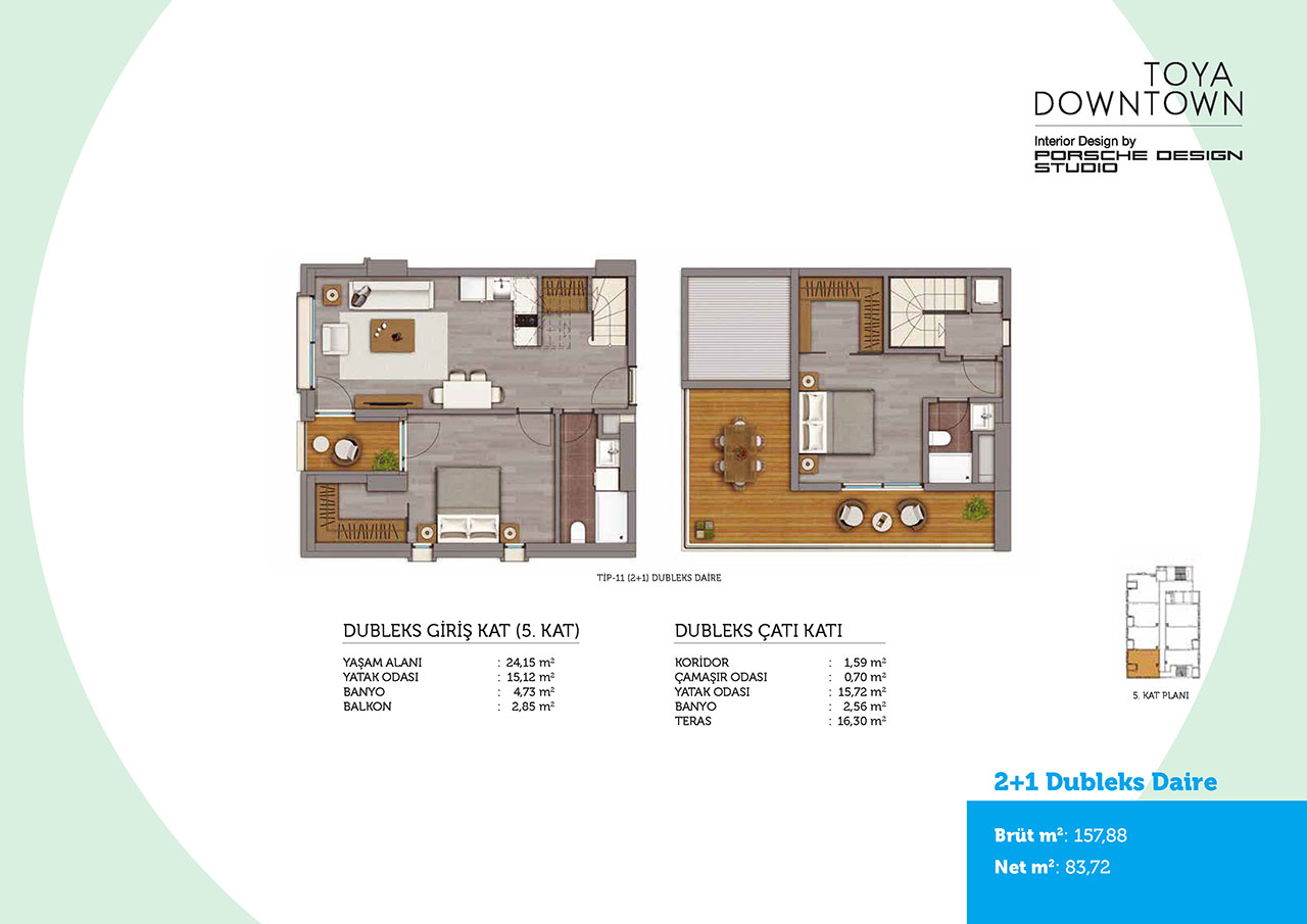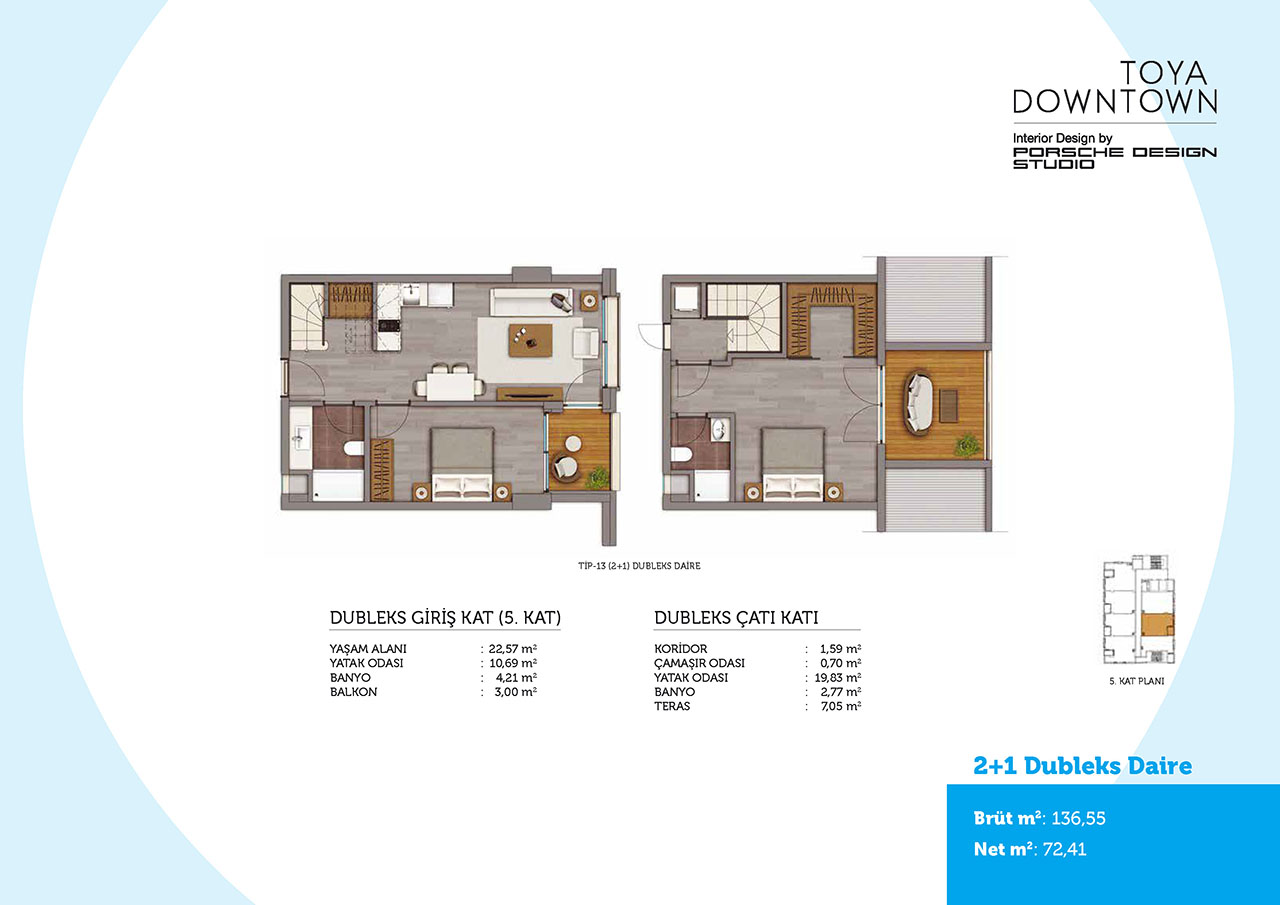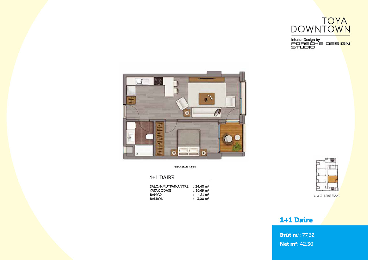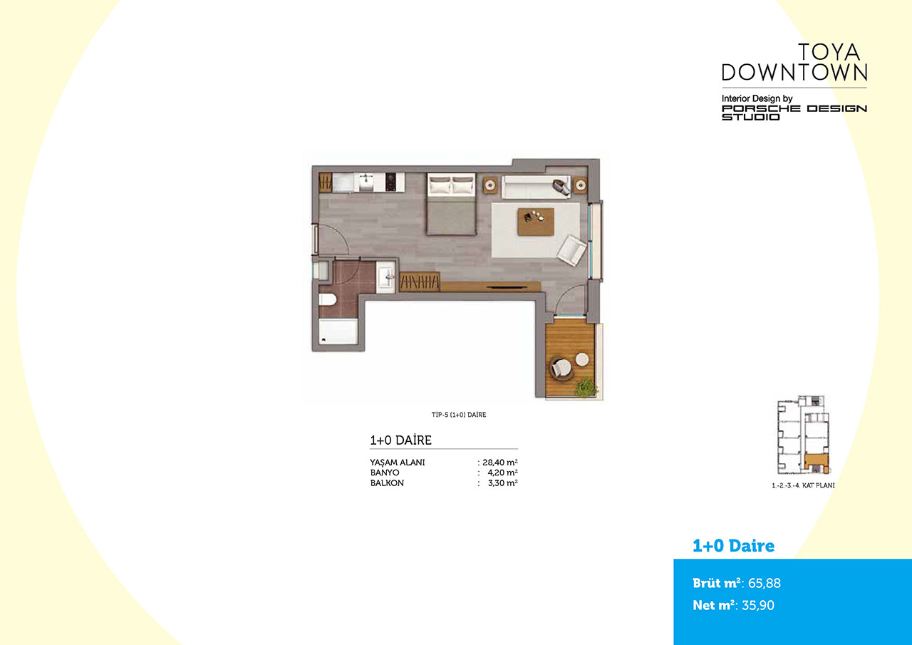 Konutların yanı sıra 6 adet ticari biriminde yer aldığı Toya Downtown projesinde bir ilk gerçekleştirildi. Porsche Desing Studio imzalı dairelerde alanları 16 ila 23 metrekare arasında değişen ofis alanı bulunuyor.
