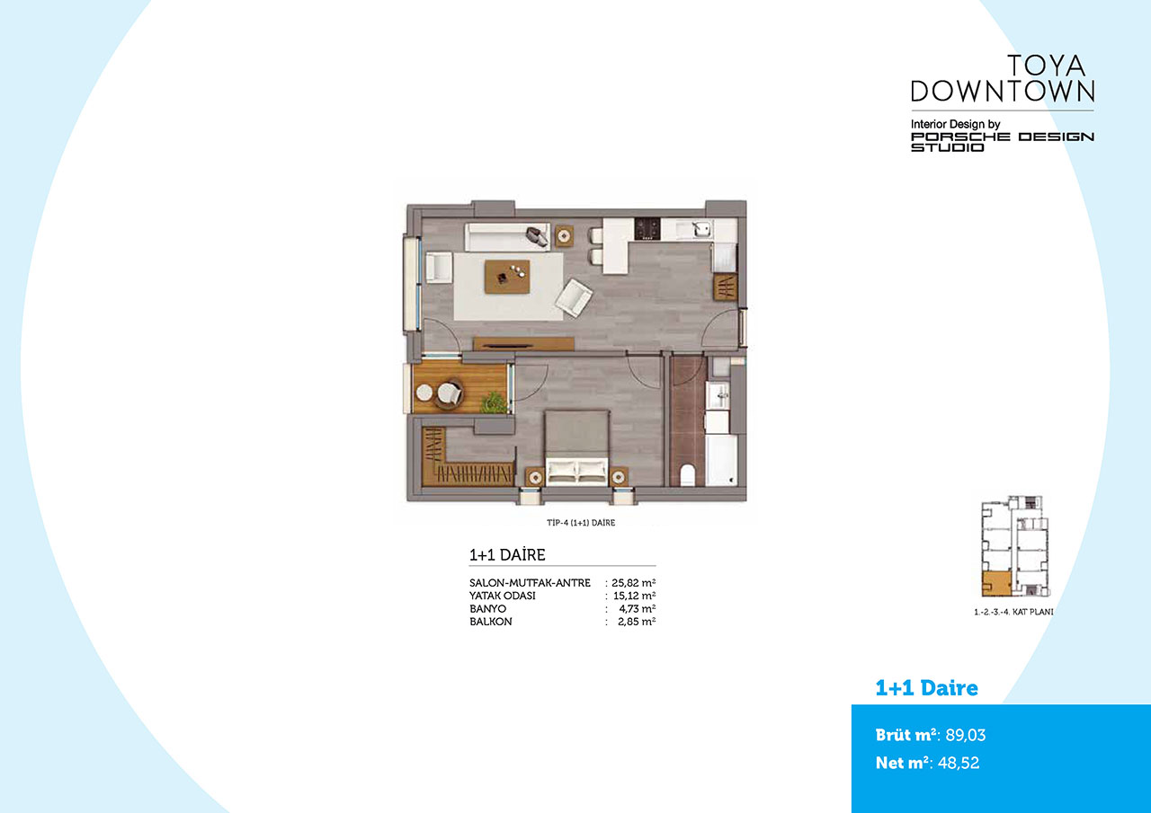 Toya Downtown projesinde stüdyo daireler brüt 65,88 metrekare, net 35,90 metrekare, 1+1 daireler brüt 75,46 ila 90,15 metrekare net 41,12 ila 49,14 metrekare arasında, 1+1 dubleks daireler brüt 115,36 net 61,17 metrekare, 2+1 dubleks daireler brüt 136,55 ila 166,74 metrekare net 72,41 ila 88,42 metrekare arasında alanlarla dizayn edildi.