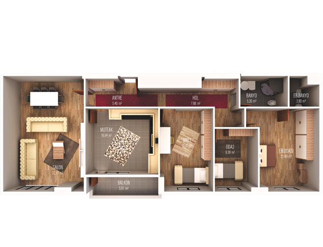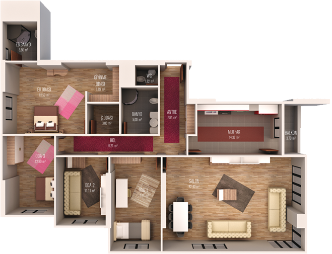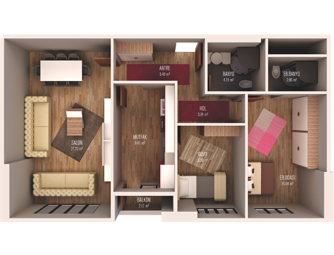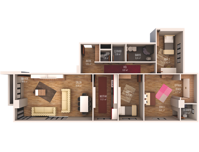 Tulip Rose Twin projesinde yer alan 2+1 daireler 105 metrekare, 3+1 daireler 150 metrekare, 162 metrekare ve 164 metrekare, 4+1 daireler ise 201 metrekare alanlarla tasarlandı.