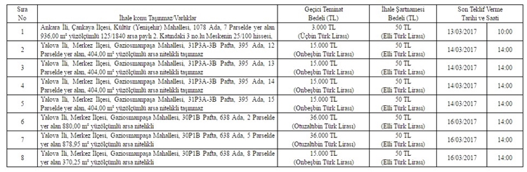 Türkiye Denizcilik İşletmeleri Anonim Şirketi, Ankara ve Yalova'da yer alan arsalarını satışa çıkartıyor...Mülkiyeti Şirkete ait olan arsalar, Ankara'da Çankaya'nın Kültür mahallesi ile, Yalova Merkez'in Gaziosmanpaşa mahallesinde yer alıyor. Satış ihalesi Ankara'daki arsa için 13 Mart Pazartesi günü saat 10:00'da, Yalova'daki arsalar için ise 14 Mart Salı günü ile 16 Mart Perşembe günü saat 14:00'da gerçekleşecek.