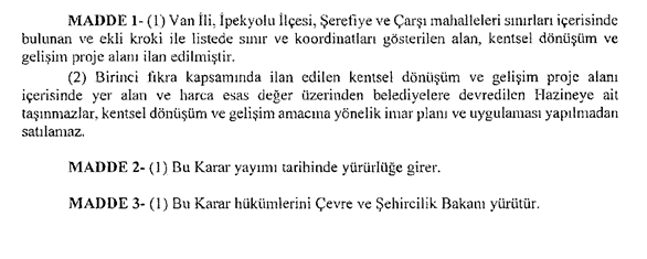 Resmi Gazete’de yayımlanarak yürürlüğe girdi. Van'ın İpekyolu İlçesi'ne bağlı Şerefiye ve Çarşı Mahalleleri'ndeki bazı alanlarda kentsel dönüşüm yapılacağı belirtildi.