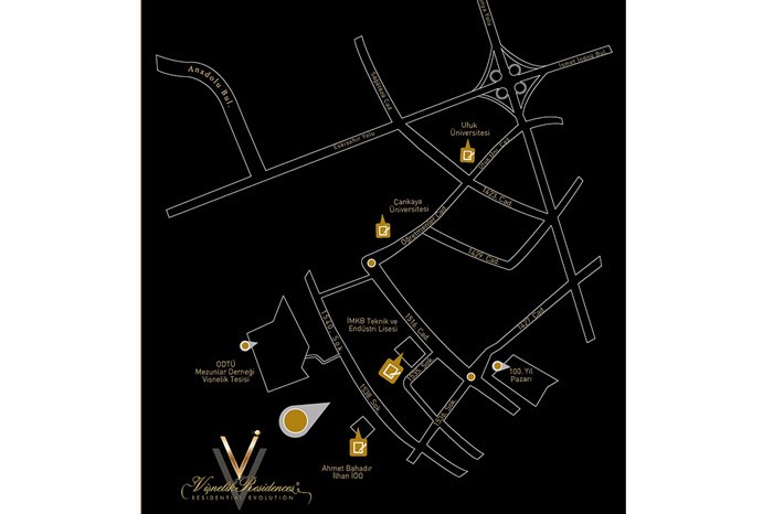 - Ankara´nın en önemli arterleri olan Eskişehir yolu ve Konya yoluna 3 kilometre mesafede bulunan Vişnelik Residences projesiyle Ankara'ya ilk defa loft tarzı rezidans daire imkanı sunuluyor.