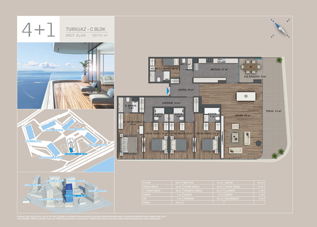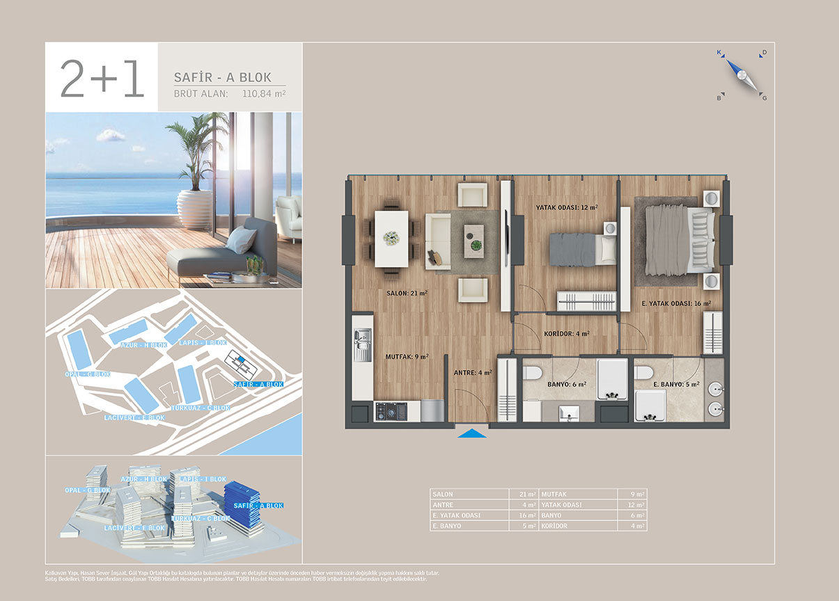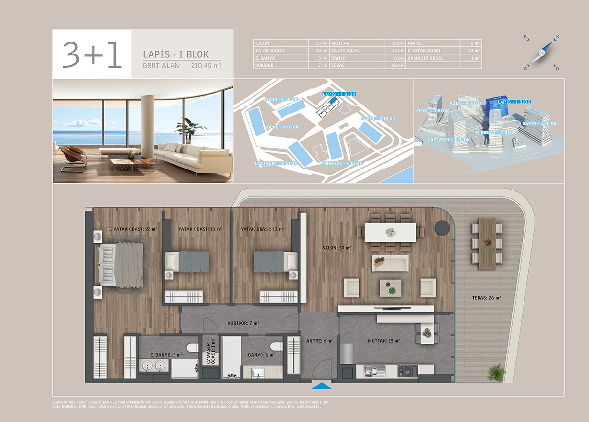 Yedi Mavi projesinde 1+1 daireler 80,27, 81,65 ve 91,4 metrekare, 2+1 daireler 110,84 ila 182,22 metrekare, 3+1 daireler 199,80 ila 237,93 metrekare, 4+1 daireler 281,66 ve 307,43 metrekare, 5+1 daireler 360,45 metrekare büyüklüklerle dizayn edildi.