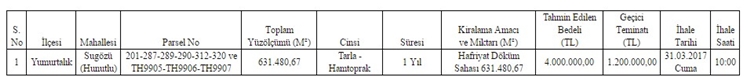 İhale 31 Mart Cuma günü saat 10:00'da Yumurtalık Malmüdürü Makam Odasında yapılacak.