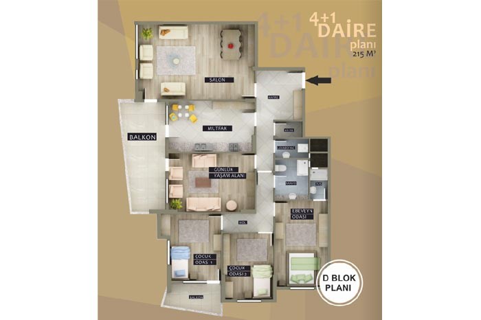 - Projede 3 oda 1 salon daireler 145 - 165 metrekare, 4 oda 1 salon daireler ise 215 metrekare büyüklüğe sahip.