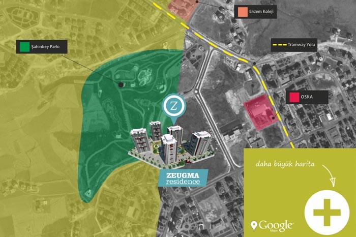 - Tramvay yoluna yakın bir noktada bulunan Zeugma Residence projesinin çevresinde 300 dönümlük Şahinbey Parkı, OSKA ve Erdem Koleji yer alıyor.