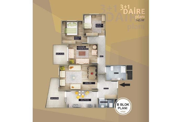 - 3 oda 1 salon ve 4 oda 1 salon dairelerden oluşan projede tapular hemen teslim ediliyor.